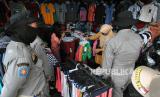 Anggota Satpol PP Kota Bogor mengawasi pedagang kaki lima (PKL) yang merapikan barang dagangannya saat penertiban di kawasan Pasar Anyar, Kota Bogor, Jawa Barat, Senin (18/5/2020).Penertiban PKL di pasar tersebut dilakukan untuk menengakkan aturan Pembatasan Sosial Berskala Besar (PSBB) di Kota Bogor sekaligus menertibkan pedagang yang mengganggu arus lalu lintas di kawasan tersebut (FOTO : ANTARA/ARIF FIRMANSYAH)