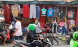 Calon pembeli memilih pakaian di pinggir jalan Ciledug Raya, Jakarta, Senin (18/5/2020). Ditutupnya Pasar Grosir Cipulir karena Pembatasan Sosial Berskala Besar (PSBB) membuat para pedagang memilih membuka lapak di pinggir jalan yang tidak jauh dari pasar tersebut (FOTO : ANTARA/MUHAMMAD IQBAL/)