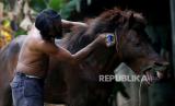Kusir delman, Haryanto, membersihkan kudanya di kolong jembatan sebuah jalan tol di Jakarta,d (FOTO : REUTERS/Willy Kurniawan)