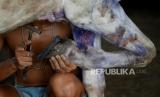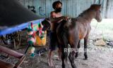 Tukang delman memasangkan ladam ke kaki kuda yang tengah diobati obat biru di kolong jembatan sebuah jalan tol di Jakarta. (FOTO : REUTERS/Willy Kurniawan)