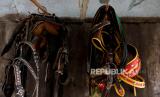 Perlengkapan kuda delman tergantung di istal dadakan di kolong sebuah jembatan tol di Jakarta. (FOTO : REUTERS/Willy Kurniawan)