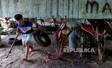 Seorang kusir menyiapkan ban bekas sebagai bahan sepatu kuda di kolong jembatan sebuah jalan tol di Jakarta. (FOTO : REUTERS/Willy Kurniawan)