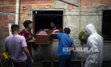Sejumlah kerabat membantu petugas pemakaman SOS yang mengenakan alat pelindung diri, mengeluarkan jasad Eldon Cascais yang meninggal setelah mengalami kesulitan bernapas saat terjadinya wabah virus Corona di Manaus, Brasil, Sabtu (9/5). (FOTO : AP/Felipe Dana)