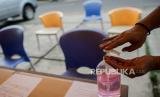 Warga membersihkan tangan dengan cairan hand sanitizer sebelum menunaikan pembayaran zakat fitrah di Masjid Nurul Huda, Kebagusan, Jakarta, Rabu (20/5). Panitia pengumpulan zakat fitrah setempat menggunakan tirai plastik pembatas, masker, dan cairan pembersih tangan dalam melayani warga yang menunaikan zakat fitrah Ramadhan untuk mencegah penyebaran COVID-19 (FOTO : Republika/Thoudy Badai)