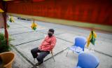 Petugas berjaga di area loket pembayaran zakat fitrah di Masjid Nurul Huda, Kebagusan, Jakarta, Rabu (20/5). Panitia pengumpulan zakat fitrah setempat menggunakan tirai plastik pembatas, masker, dan cairan pembersih tangan dalam melayani warga yang menunaikan zakat fitrah Ramadhan untuk mencegah penyebaran COVID-19 (FOTO : Republika/Thoudy Badai)