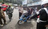 REPUBLIKA.CO.ID, BOGOR -- Petugas gabungan menghentikan pengendara sepeda motor yang diduga akan mudik di titik pemeriksaan perbatasan Cianjur - Bogor, Jalan Raya Puncak, Kabupaten Cianjur, Jawa Barat, Kamis (21/5/2020).