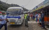 Petugas gabungan menurunkan penumpang angkutan umum antarkota untuk mengecek identitas dan memberikan imbauan kepada warga di titik pemeriksaan perbatasan Cianjur - Bogor, Jalan Raya Puncak, Kabupaten Cianjur, Jawa Barat, Kamis (21/5/2020). Petugas gabungan memperketat akses keluar masuk kendaraan yang melewati perbatasan dalam pemberlakuan Pembatasan Sosial Berskala Besar (PSBB) di Cianjur Jawa Barat (FOTO : Antara/Yulius Satria Wijaya )