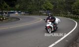 Pengendara sepeda motor melintas di Jalan Raya Puncak, Kabupaten Bogor, Jawa Barat, Kamis (21/5/2020). Kawasan wisata Puncak terpantau sepi pada masa pemberlakuan Pembatasan Sosial Berskala Besar (PSBB) (FOTO : Antara/Yulius Satria Wijaya )