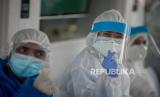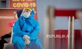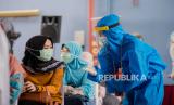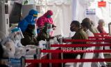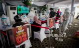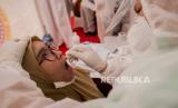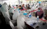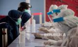 REPUBLIKA.CO.ID, DEPOK -- Petugas Medis mengatur jarak fisik warga saat rapid test massal di Depok, Jawa Barat, Jumat (22/5).