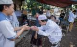 Sejumlah warga melakukan halal bi halal kepada keluarga terdekat dan tetangganya pada perayaan Hari Raya Idul Fitri 1 Syawal 1441 Hijriyah di kawasan Kalibaru, Bekasi, Jawa Barat, Ahad (24/5). Kegiatan silaturahmi dan halal bi halal tetap dilaksanakan warga setempat di kawasan tersebut (FOTO : Republika/Thoudy Badai)
