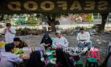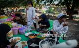 Sejumlah warga menyantap makanan usai melaksanakan shalat Idul Fitri 1 Syawal 1441 Hijriyah di kawasan Kalibaru, Bekasi, Jawa Barat, Ahad (24/5). Kegiatan silaturahmi dan halal bi halal tetap dilaksanakan warga setempat di kawasan tersebut (FOTO : Republika/Thoudy Badai)