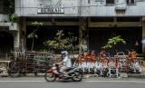 Pengendara motor melintas di dekat troli pedagang di kawasan Tanah Abang, Jakarta, Senin (25/5). Hari kedua Hari Raya Idul Fitri 1441 Hijriyah dan masih berlakunya masa Pembatasan Sosial Berskala Besar (PSBB) membuat Pasar Tanah Abang sepi dari aktivitas perdagangan (FOTO : Republika/Putra M. Akbar)