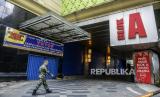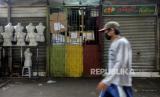 Seorang warga melintas di dekat pertokoan yang tutup di kawasan Tanah Abang, Jakarta, Senin (25/5). Hari kedua Hari Raya Idul Fitri 1441 Hijriyah dan masih berlakunya masa Pembatasan Sosial Berskala Besar (PSBB) membuat Pasar Tanah Abang sepi dari aktivitas perdagangan (FOTO : Republika/Putra M. Akbar)