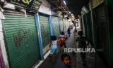 Anak-anak bermain di dekat pertokoan yang tutup di kawasan Tanah Abang, Jakarta, Senin (25/5). Hari kedua Hari Raya Idul Fitri 1441 Hijriyah dan masih berlakunya masa Pembatasan Sosial Berskala Besar (PSBB) membuat Pasar Tanah Abang sepi dari aktivitas perdagangan (FOTO : Republika/Putra M. Akbar)