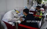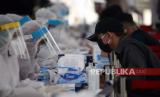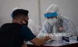 REPUBLIKA.CO.ID, JAKARTA -- Petugas medis mengambil sampel darah warga saat mengikuti rapid test Covid-19 di trotoar kawasan Bundaran HI, Selasa (26/5).