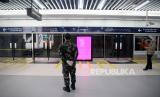 Personel TNI berjaga di Stasiun MRT Bundaraan HI, Jakarta, Selasa (26/5). Ke depannya aparat gabungan TNI dan Polri akan dikerahkan ke berbagai lokasi keramaian untuk mengawasi aktivitas masyarakat dalam penerapan new normal di tengah pandemi covid-19 (FOTO : Republika/Prayogi)