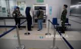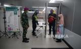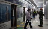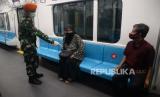 Personil TNI mengimbau penumpang untuk menerapkan jaga jarak di dalam rangkaian MRT, Bundaran HI, Jakarta, Selasa (26/5). Ke depannya aparat gabungan TNI dan Polri akan dikerahkan ke berbagai lokasi keramaian untuk mengawasi aktivitas masyarakat dalam penerapan new normal di tengah pandemi covid-19 (FOTO : Prayogi/Republika)