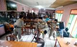 Petugas gabungan saat menertibkan rumah makan yang menyediakan untuk makan di tempat di Cisarua, Puncak, Kabupaten Bogor, Jawa Barat, Selasa (26/5/2020). Penertiban tersebut untuk mengurangi kerumunan warga serta wisatawan, dan sabagai upaya pemutusan mata rantai COVID-19 di masa Pembatasan sosial berskala besar (PSBB) di kawasan wisata Puncak Bogor. (FOTO : Antara/Yulius Satria Wijaya)