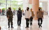 Presiden Joko Widodo (tengah) bersama Panglima TNI Marsekal Hadi Tjahjanto (kanan) dan Kapolri Jenderal Pol Idham Aziz (kedua kiri) meninjau salah satu pusat perbelanjaan, di Bekasi, Jawa Barat, Selasa (26/5/2020). Presiden Jokowi meninjau persiapan prosedur pengoperasian mal yang berada di wilayah zona hijau wabah COVID-19 (FOTO : Republika/Edwin Dwi Putranto)