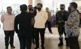 Presiden Joko Widodo (kiri) bersama Panglima TNI Marsekal Hadi Tjahjanto (ketiga kanan), Kapolri Jenderal Pol Idham Aziz (keempat kanan) dan Gubernur Jawa Barat Ridwan Kamil (kanan), meninjau salah satu pusat perbelanjaan, di Bekasi, Jawa Barat, Selasa (26/5/2020). Presiden Jokowi meninjau persiapan prosedur pengoperasian mal yang berada di wilayah zona hijau wabah COVID-19 (FOTO : Republika/Edwin Dwi Putranto)