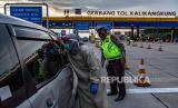 Petugas kesehatan memeriksa suhu pengendara roda empat saat penyekatan pemudik di Gerbang Tol Kalikangkung, Semarang, Jawa Tengah (26/5/2020). Satlantas Polrestabes Semarang mencatat sejak pukul 07:00 - 17:00 WIB sebanyak 276 kendaraan bermotor roda empat maupun bus yang mengangkut pemudik menuju DKI Jakarta melalui gerbang tol tersebut diperintahkan untuk memutar balik karena tidak dilengkapi surat ijin keluar-masuk (SIKM) (FOTO : ANTARA/aji styawan)