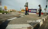 Petugas memasang pembatas jalan saat penutupan ke arah Jakarta di pintu keluar tol Adiwerna, Kabupaten Tegal, Jawa Tengah, Selasa (26/5/2020). Polres Tegal, Dinas Perhubungan dan pihak tol Pejagan-Pemalang pada arus balik H+2 mulai menutup akses masuk tol ke arah Jakarta untuk mencegah penyebaran COVID-19 (FOTO : ANTARA/Oky Lukmansyah)
