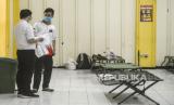 Seorang petugas memberikan penjelasan kepada penumpang kereta yang dikarantina di Gedung Auditorium Gelanggang Remaja, Gambir, Jakarta, Rabu (27/5). Pemerintah Kota Jakarta Pusat menyiapkan Gedung Auditorium Gelanggang Remaja sebagai tempat karantina bagi pendatang yang menuju Ibu Kota tanpa memiliki Surat Izin Keluar Masuk (SIKM) (FOTO : Republika/Putra M. Akbar)