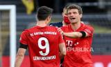 Bayern Munich Thomas Mueller (kanan) dan Robert Lewandowski merayakan setelah pertandingan sepakbola Bundesliga Jerman antara Borussia Dortmund dan FC Bayern Munich di Signal Iduna Park di Dortmund, Jerman, Selasa (26/5). Bayern Munich berhasil meraih point penuh dengan mengalahkan Borussia Dortmund dengan skor 1-0 (FOTO : DPA POOL)