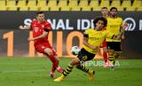Pemain Bayern Munich Robert Lewandowski (kiri) dan pemain Dortmund Axel Witsel beraksi saat pertandingan sepak bola Bundesliga Jerman antara Borussia Dortmund dan FC Bayern Munich di Signal Iduna Park di Dortmund, Jerman,Selasa (26/5). Bayern Munich berhasil meraih point penuh dengan mengalahkan Borussia Dortmund dengan skor 1-0 (FOTO : DPA POOL)