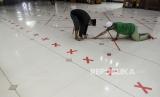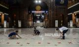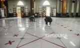 Sejumlah pengurus masjid memasangkan tanda silang untuk membatasi shaf jamaah di Masjid Agung Al-Barkah, Kota Bekasi, Jawa Barat, Kamis (28/5). Pemerintah Kota Bekasi mulai membuka Masjid untuk kegiatan Shalat Jumat di wilayah zona hijau COVID-19 dengan tetap menerapkan protokol kesehatan (FOTO : Republika/Putra M. Akbar)