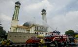 Sejumlah petugas pemadam kebakaran menyemprotkan disinfektan di Masjid Agung Al-Barkah, Kota Bekasi, Jawa Barat, Kamis (28/5). Pemerintah Kota Bekasi mulai membuka Masjid untuk kegiatan Shalat Jumat di wilayah zona hijau COVID-19 dengan tetap menerapkan protokol kesehatan (FOTO : Republika/Putra M. Akbar)