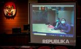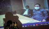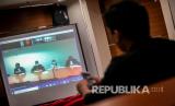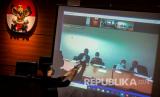 Petugas menyaksikan sidang dakwaan kasus dugaan korupsi penetapan pergantian antar waktu (PAW) anggota DPR periode 2019-2024 secara virtual dengan terdakwa mantan Komisioner Bawaslu Wahyu Setiawan (kedua kiri) dan mantan anggota Bawaslu Agustiani Tio Fridelina (ketiga kiri) di Gedung KPK, Jakarta, Kamis (28/5/2020). Mantan anggota Komisi Pemilihan Umum Wahyu Setiawan didakwa telah menerima suap melalui perantaraan Agustiani Tio Fridelina sebesar Rp600 juta dari Saeful Bahri dan Harun Masiku agar KPU menyetujui permohonan Penggantian Antar Waktu (PAW) yang diajukan PDIP. (FOTO : Antara/Aprillio Akbar)