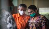 Mantan Komisioner KPU Wahyu Setiawan (kiri) berbincang dengan kuasa hukumnya seusai menjalani sidang dakwaan secara virtual dalam kasus dugaan korupsi penetapan pergantian antar waktu (PAW) anggota DPR periode 2019-2024 di Gedung KPK, Jakarta, Kamis (28/5/2020). Mantan anggota Komisi Pemilihan Umum Wahyu Setiawan didakwa telah menerima suap melalui perantaraan Agustiani Tio Fridelina sebesar Rp600 juta dari Saeful Bahri dan Harun Masiku agar KPU menyetujui permohonan Penggantian Antar Waktu (PAW) yang diajukan PDIP (FOTO : Antara/Aprillio Akbar)