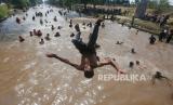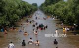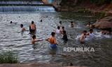 Warga pun mendinginkan tubuh dengan berbagai cara termasuk berendam di kanal saat gelombang panas di Lahore, Pakistan, Selasa (26/5).
