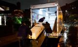 Petugas memasukan jenazah COVID-19 kedalam mobil truk untuk dikremasi di Buffalo, di Rumah Duka Gerald J. Neufeld di Elmhurst, New York, AS, Minggu (26/5) (FOTO : EPA-EFE/JUSTIN LANE)