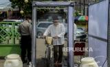 Umat Muslim disemprotkan disinfektan sebelum melaksanakan ibadah Shalat Jumat di Masjid Agung Al-Barkah, Kota Bekasi, Jawa Barat, Jumat (29/5). Shalat Jumat perdana setelah kurang lebih dua bulan tidak dilaksanakan karena pandemi virus Corona itu menerapkan protokol kesehatan dan pembatasan jarak fisik 1,2 meter setiap jamaah (FOTO : Republika/Putra M. Akbar)