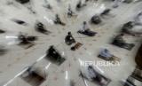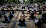Sejumlah umat Muslim berdoa sebelum melaksanakan ibadah Shalat Jumat di Masjid Agung Al-Barkah, Kota Bekasi, Jawa Barat, Jumat (29/5). Shalat Jumat perdana setelah kurang lebih dua bulan tidak dilaksanakan karena pandemi virus Corona itu menerapkan protokol kesehatan dan pembatasan jarak fisik 1,2 meter setiap jamaah (FOTO : Republika/Putra M. Akbar)
