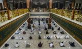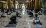 Sejumlah umat Muslim melaksanakan ibadah Shalat Jumat di Masjid Agung Al-Barkah, Kota Bekasi, Jawa Barat, Jumat (29/5). Shalat Jumat perdana setelah kurang lebih dua bulan tidak dilaksanakan karena pandemi virus Corona itu menerapkan protokol kesehatan dan pembatasan jarak fisik 1,2 meter setiap jamaah (FOTO : Republika/Putra M. Akbar)