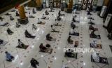 Sejumlah umat Muslim berdoa saat melaksanakan ibadah Shalat Jumat di Masjid Agung Al-Barkah, Kota Bekasi, Jawa Barat, Jumat (29/5). Shalat Jumat perdana setelah kurang lebih dua bulan tidak dilaksanakan karena pandemi virus Corona itu menerapkan protokol kesehatan dan pembatasan jarak fisik 1,2 meter setiap jamaah (FOTO : Republika/Putra M. Akbar)