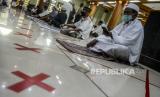 Sejumlah umat Muslim bersiap melaksanakan ibadah Shalat Jumat di Masjid Agung Al-Barkah, Kota Bekasi, Jawa Barat, Jumat (29/5). Shalat Jumat perdana setelah kurang lebih dua bulan tidak dilaksanakan karena pandemi virus Corona itu menerapkan protokol kesehatan dan pembatasan jarak fisik 1,2 meter setiap jamaah (FOTO : Republika/Putra M. Akbar)