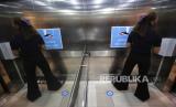 Pengunjung berdiri di dalam lift yang dioperasikan dengan kaki di pusat perbelanjaan Seacon Square di Bangkok, Thailand, Rabu (20/5). List di pusat perbelanjaan ini memasang tombol lift yang dioperasikan dengan kaki sebagai langkah untuk menekan penyebaran Covid-19 (FOTO : EPA)