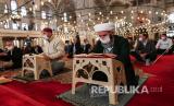 Jamaah membaca Quran saat mereka sholat Jumat di Masjid Fatih, Istanbul, Turki, Jumat (29/5). Shalat Jumat setelah 74 hari dengan jarak sosial di tengah pandemi virus corona. (FOTO : EPA -EFE / SEDAT SUNA)