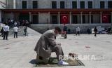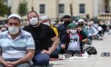 Orang-orang memakai masker saat mereka menghadiri sholat Jumat di Masjid Fatih, Istanbul, Turki, Jumat (29/5). Shalat Jumat setelah 74 hari dengan jarak sosial di tengah pandemi virus corona. (FOTO : EPA -EFE / SEDAT SUNA)