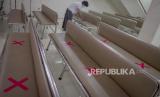 Pengurus Gereja menempelkan tanda menjaga jarak pada kursi jamaat di Gereja Kristen Indonesia (GKI) Kartasura, Sukoharjo, Jawa Tengah, Sabtu (30/5/2020). Gereja tersebut mulai mempersiapkan normal baru untuk kegiatan ibadah di Gereja dengan memberi tanda menjaga jarak dan menerapkan protokol kesehatan kepada seluruh jemaat (FOTO : MOHAMMAD AYUDHA/ANTARA FOTO)