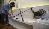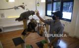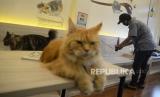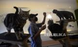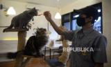 Pekerja memberi makan kucing di Kopi Cat Cafe by Groovy Kemang, Jakarta, Senin (1/6). Cafe dengan konsep bersantai ditemani kucing tersebut akan menerapkan protokol kesehatan ketika diberlakukannya kebijakan normal baru, salah satunya adalah mengurangi jumlah pengunjung, menjaga jarak, wajib memakai masker dan membersihkan kucing setiap satu jam sekali (FOTO : Prayogi/Republika)