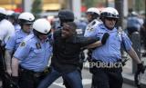 Pengunjuk rasa ditahan polisi pada aksi di Philadelphia, aksi solidaritas ini merupakan buntut atas tewasnya George Floyd oleh polisi di Minneapolis. (FOTO : AP Photo/Matt Rourke)