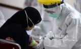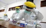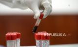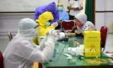 Petugas kesehatan memeriksa sampel darah saat Rapid Diagnostic Test (RDT) pedagang di Pasar Beringharjo, Yogyakarta, Rabu (3/6). Sebanyak 58 pedagang pasar secara acak menjalani RDT dari Dinkes Kota Yogyakarta (FOTO : Wihdan Hidayat/ Republika)