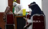 Petugas kesehatan bersama pedagang saat Rapid Diagnostic Test (RDT) di Pasar Beringharjo, Yogyakarta, Rabu (3/6). Sebanyak 58 pedagang pasar secara acak menjalani RDT dari Dinkes Kota Yogyakarta (FOTO : Wihdan Hidayat/ Republika)