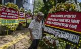 Warga melintasi karangan bunga di Pengadilan Tipikor, Jakarta, Rabu (3/6/2020). Karangan bunga tersebut berasal dari korban terdampak kasus asuransi Jiwasraya yang mengharapkan lembaga terkait untuk memberikan keadilan bagi mereka (FOTO : Antara/Galih Pradipta)
