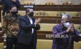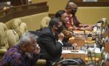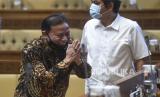 Hadir Ketua Komisi Pemilihan Umum (KPU) Arief Budiman (kanan) bersama Ketua DKPP Muhammad (tengah) dan Ketua Bawaslu Abhan (kiri) bersiap mengikuti rapat dengar pendapat (RDP) dengan Komisi II DPR. Rapat tersebut membahas rasionalisasi anggaran pelaksanaan Pilkada serentak tahun 2020.
